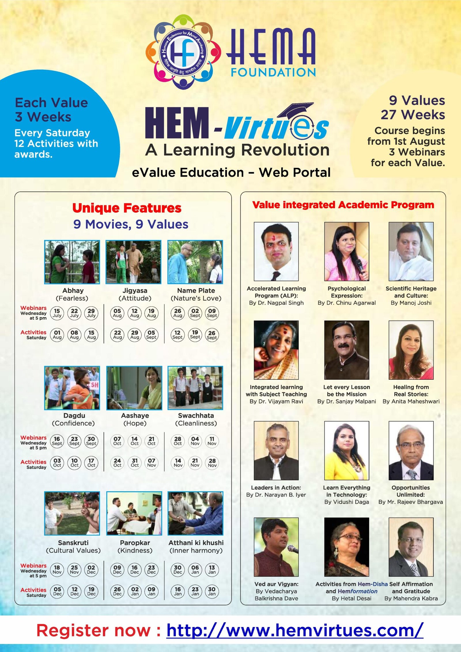 वहीं छात्रों का शैक्षणिक सत्र एक अगस्त से शुरू हो रहा है। इसमें हर विषय से जुड़ी अनेक गतिविधियां हर शनिवार को करायी जाएंगी। यह कोर्स 30 जनवरी 2021 को पूर्ण होगा। प्रसिद्ध फिल्म अभिनेता मनोज जोशी ने विशेष आग्रह किया कि नैतिक मूल्यों को वैश्विक स्तर पर वापस जगह दिलाने के प्रयास में हेमा फाउंडेशन विभिन्न शैक्षिणिक संस्थानों, सामाजिक संगठनों आदि का सहयोग चाहता है।
