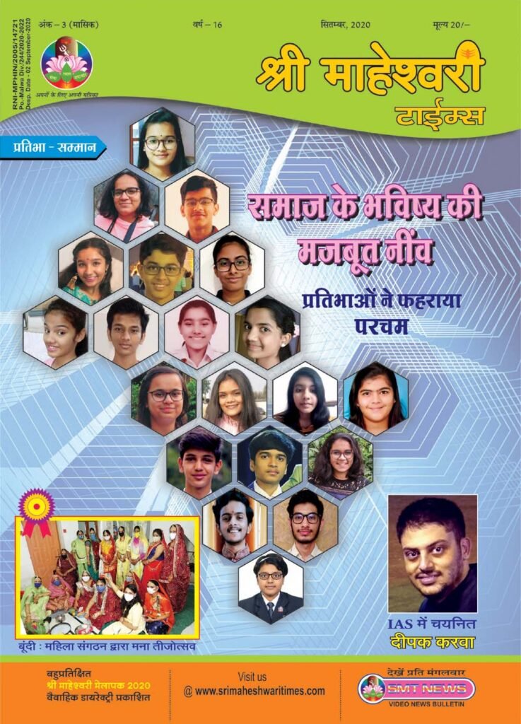 श्री माहेश्वरी टाईम्स का यह अंक समाज की प्रतिभा को समर्पित ‘‘प्रतिभा विशेषांक’’ था, जिसमें विभिन्न बोर्ड परीक्षाओं में उल्लेखनीय सफलता प्राप्त करने वाली प्रतिभाओं का संक्षिप्त परिचय प्रकाशित किया गया। इसी माह 18 सितम्बर से प्रारम्भ हो रहे पुरूषोत्तम मास के महत्व तथा इस अवधि में किये जाने वाले कर्मकांडों आदि की जानकारी भी समाजहित में दी गई।