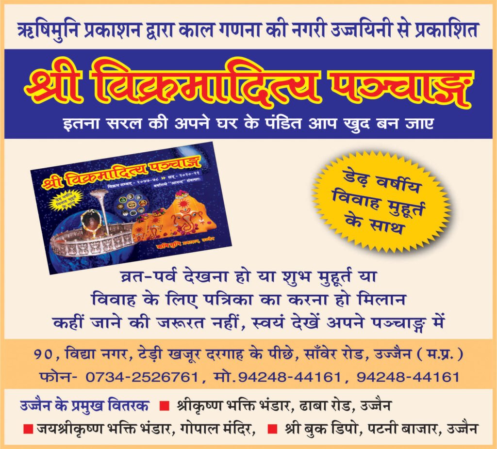 उज्जैन। प्रतिष्ठित ऋषिमुनि प्रकाशन समूह द्वारा गत २३ वर्षों से सतत प्रकाशित चौविसवां संस्करण श्री विक्रमादित्य पंचांग (कार्तिकादि) के नवीन विक्रम संवत २०७७-७८ के पंचांग का गत दिवस विमोचन हुआ। इसमें इस बार एक वर्ष के स्थान पर डेढ़ वर्षीय विवाह मुहूर्त दिये गये हैं। यह पंचांग आम पाठकों के बीच घर का पंडित के रूप में लोकप्रिय है।
