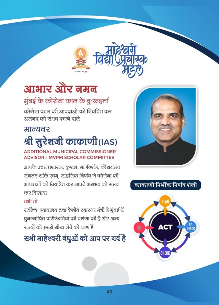 कोरोना महामारी की दूसरी लहर हमारे देश में अत्यंत भयानक विपदा बनकर आई है, जिसने न सिर्फ परिवारों के सदस्यों बल्कि कई परिवारों को ही अकाल मृत्यु का ग्रास बना दिया। ऐसे में भी देश की सबसे सघन आबादी वाला महानगर मुम्बई अन्य शहरों की तरह परेशान नहीं हुआ, जबकि सम्पूर्ण महाराष्ट्र प्रदेश इससे सबसे अधिक प्रभावित था। इसका श्रेय जाता है, मुम्बई महानगरपालिका को जिसने एक ऐसी योजना बनाकर काम किया जिसके सामने कोरोना को भी घुटने टेकने के लिये मजबूर होना पड़ गया। इस योजना को तैयार करने में अहम भूमिका निभाने का श्रेय जाता है, मुम्बई महानगर पालिका के एडिशनल म्यूनिसिपल कमिश्नर तथा माहेश्वरी समाज के गौरव IAS सुरेश काकाणी को।